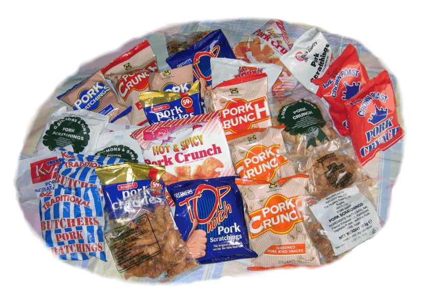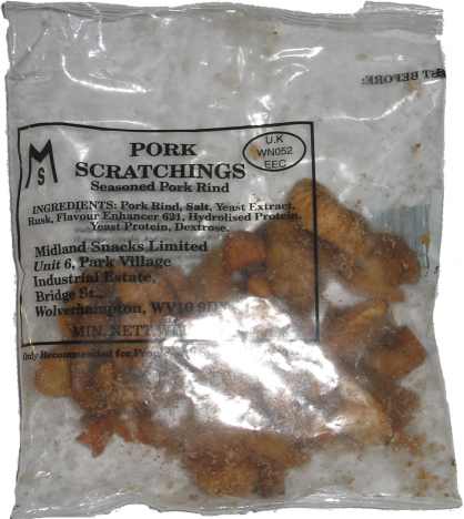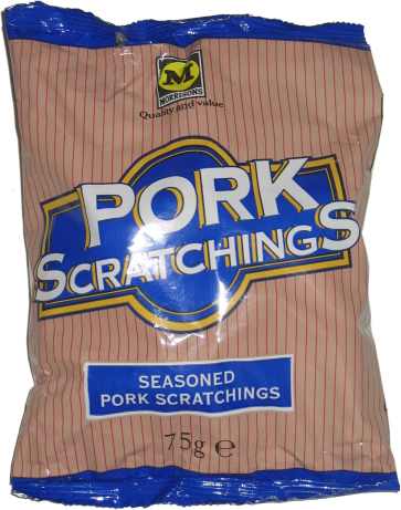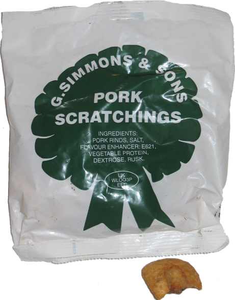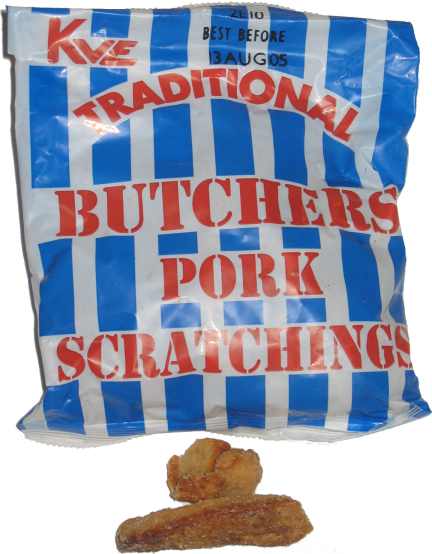 scratchings, with a very porky smell and flavour. Lightly salted,